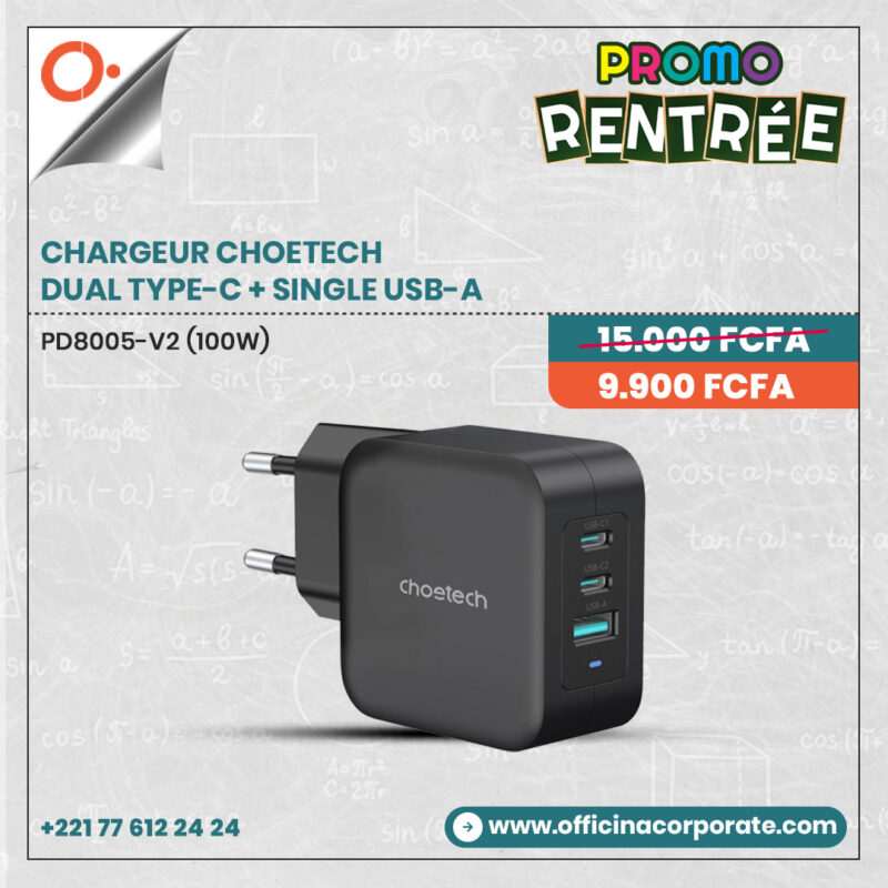 CHARGEUR CHOETECH DUAL TYPE-C + SINGLE USB- A