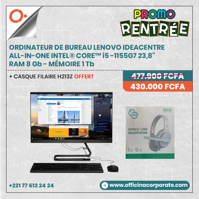 ORDINATEUR DE BUREAU LENOVO IDEACENTRE ALL-IN-ONE INTEL® CORETM ¡5 -1155G7 23,8″ RAM 8 Gb – MÉMOIRE 1 Tb